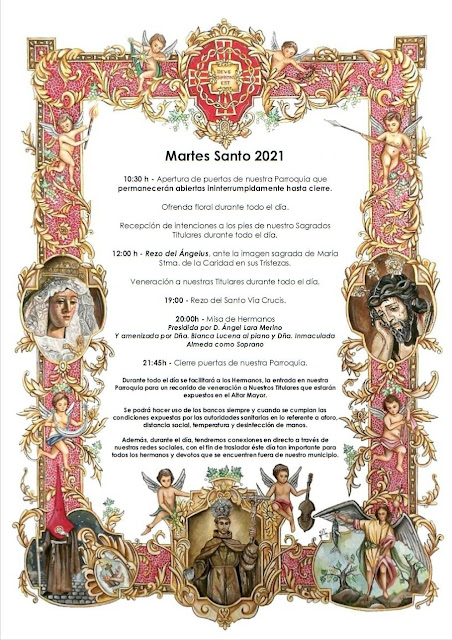 "Durante todo el día se facilitará a los hermanos la entrada en nuestra parroquia para un recorrido de veneración a nuestros titulares, que estarán expuestos en el altar mayor. Se podrá hacer uso de los bancos siempre y cuando se cumplan las condiciones expuestas por las autoridades sanitarias en lo referente a aforo, distancia social, temperatura y desinfección de manos".